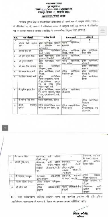 рджреЗрд╣рд░рд╛рджреВрди рдиреНрдпреВреЫ :- рд░рд╛рдЬреНрдп рд╕рд░рдХрд╛рд░ рджреНрд╡рд╛рд░рд╛ рднрд╛рд░рддреАрдп рдкреБрд▓рд┐рд╕ рд╕реЗрд╡рд╛ (IPS) рдХреЗ 15 рдЕрдзрд┐рдХрд╛рд░рд┐рдпреЛрдВ рдХреЗ рд╡реНрдпрд╛рдкрдХ рд╕реНрдерд╛рдирд╛рдВрддрд░рдг/рддреИрдирд╛рддреА рдЖрджреЗрд╢ рдЬрд╛рд░реА рдХрд┐рдП рдЧрдП рд╣реИрдВред рд╢рд╛рд╕рди рджреНрд╡рд╛рд░рд╛ рдЬрд╛рд░реА рдЖрджреЗрд╢ рдХреЗ рдЕрдиреБрд╕рд╛рд░ рдирд┐рдореНрдирд▓рд┐рдЦрд┐рдд рдЕрдзрд┐рдХрд╛рд░рд┐рдпреЛрдВ рдХреЛ рдЙрдирдХреЗ рд╡рд░реНрддрдорд╛рди рдкрдж рд╕реЗ рд╣рдЯрд╛рдХрд░ рдирдИ рддреИрдирд╛рддреА рдкреНрд░рджрд╛рди рдХреА рдЧрдИ рд╣реИред рд╕рднреА рдЕрдзрд┐рдХрд╛рд░реА рддрддреНрдХрд╛рд▓ рдкреНрд░рднрд╛рд╡ рд╕реЗ рдЕрдкрдирд╛ рдХрд╛рд░реНрдпрднрд╛рд░ рдЧреНрд░рд╣рдг рдХрд░реЗрдВрдЧреЗред