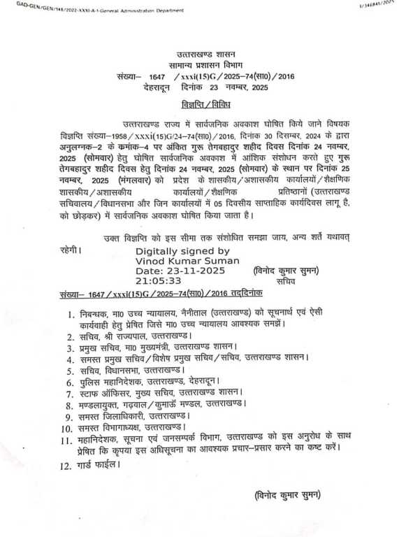 देहरादून न्यूज़ :- उत्तराखंड शासन, सामान्य प्रशासन विभाग ने गुरु तेगबहादुर शहीद दिवस पर घोषित अवकाश में संशोधन करते हुए नया आदेश जारी किया है। पहले यह सार्वजनिक अवकाश 24 नवंबर 2025 (सोमवार) को निर्धारित था, जिसे संशोधित करते हुए अब 25 नवंबर 2025 (मंगलवार) को सार्वजनिक अवकाश घोषित किया गया है।