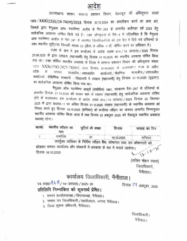 नैनीताल न्यूज़ :- जिलाधिकारी नैनीताल ललित मोहन रयाल ने जानकारी देते हुए बताया कि उत्तराखण्ड शासन, सामान्य प्रशासन विभाग, देहरादून के आदेश के अनुपालन में आगामी 18 अक्टूबर 2025 (शनिवार) को धनतेरस पर्व के अवसर पर जनपद नैनीताल के सभी शासकीय, अर्धशासकीय कार्यालयों, कोषागारों तथा उप कोषागारों में स्थानीय अवकाश घोषित किया गया है।