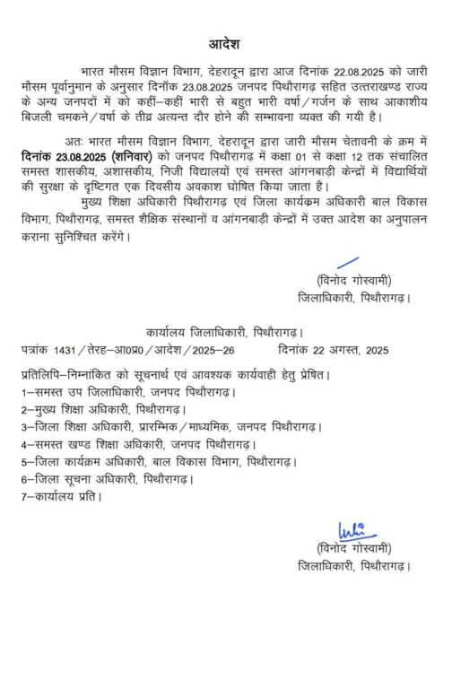 पिथौरागढ़ न्यूज़ :- भारी वर्षा की संभावित परिस्थिति को देखते हुए जिला प्रशासन द्वारा एहतियाती कदम उठाए गए हैं। इसी क्रम में कल दिनांक 23 अगस्त (शनिवार) को जनपद पिथौरागढ़ में कक्षा 1 से 12 तक संचालित सभी शासकीय, अशासकीय एवं निजी विद्यालयों सहित आंगनबाड़ी केन्द्र बन्द रहेंगे।